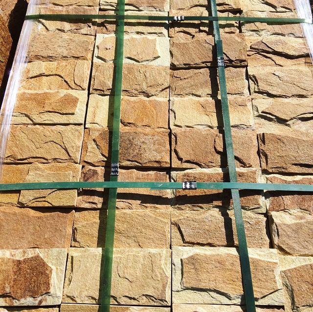 Камень златолит жёлтый добывается на карьере и разделяется по толщинам для традиционного применения в строительстве - облицовки и мощения: