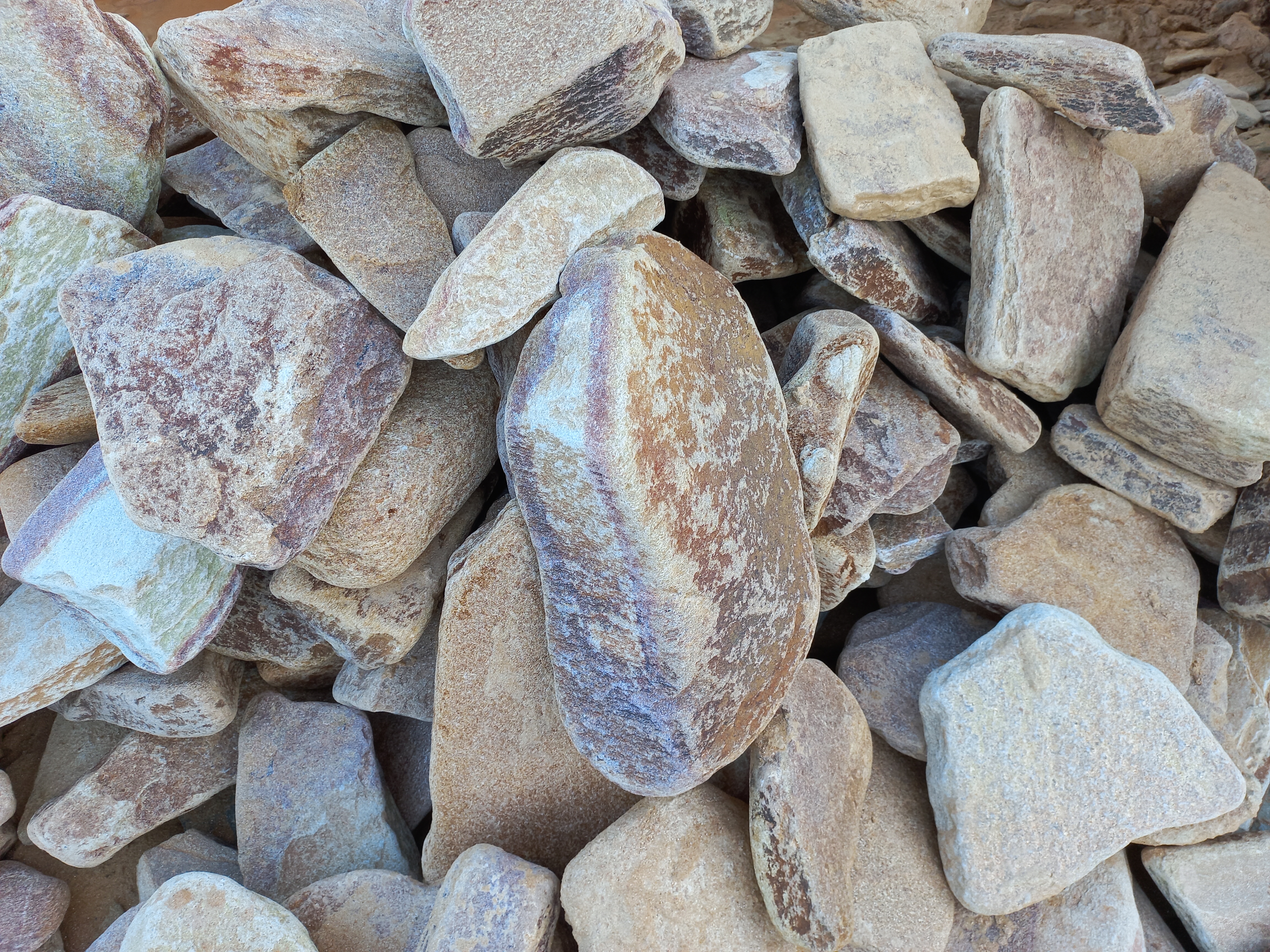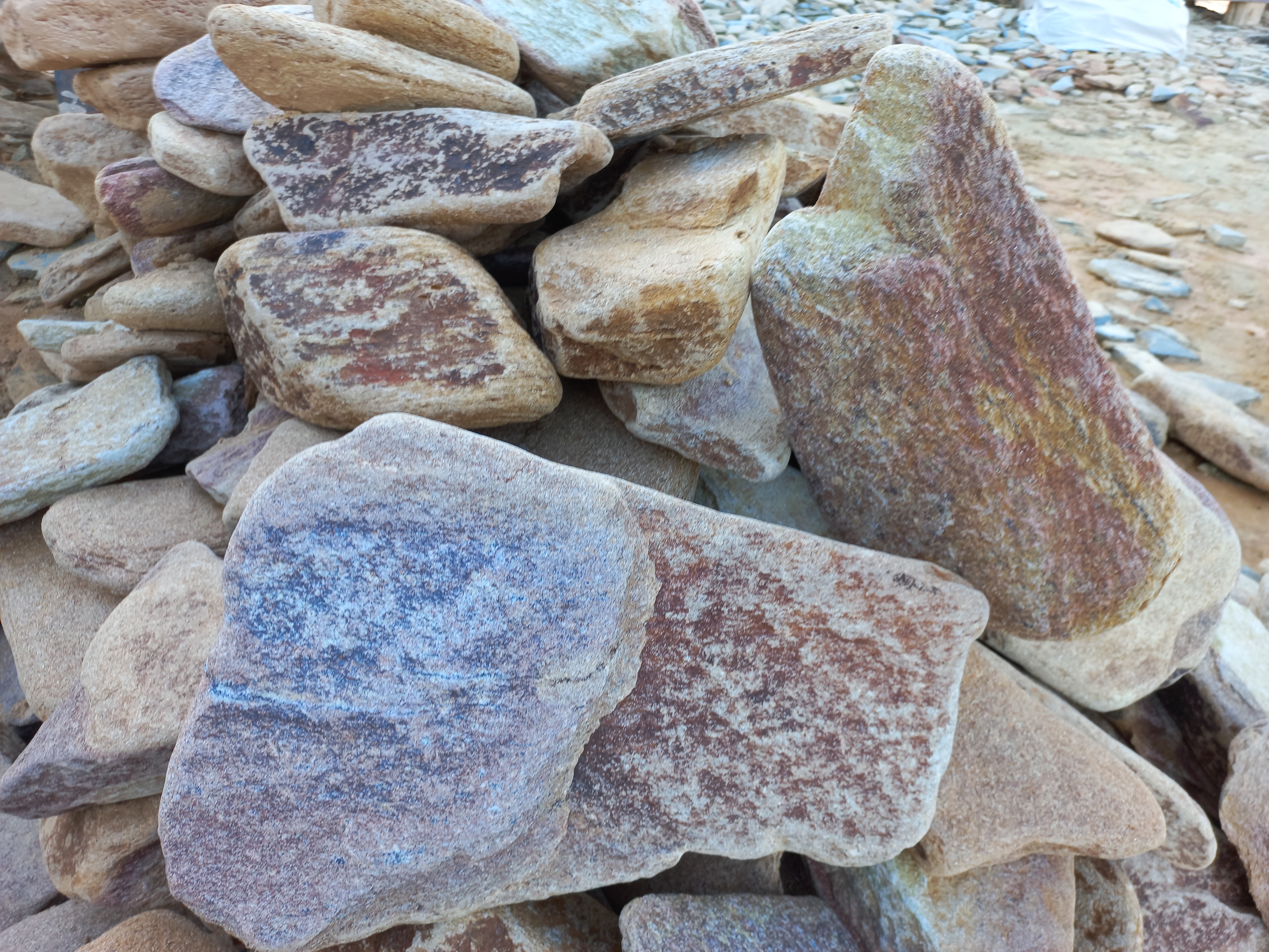 - плитняк дикий галтованный(окатанный, скруглённый) – камень природной форме, прошедший процесс галтовки в барабане. В процессе галтовки в барабан загружается камень природной формы, плитки камня бьются друг об друга, стачивая и сбивая неровные, острые края. После завершения технологической операции камень приобретает округлую форму краёв, становится похож на состаренный камень – как будто он сотни лет пролежал под воздействием ветра и дождей. Галтованный камень при облицовке придаёт объекту вид старины, таинственности. Если галтованным камнем выкладывают дорожки или площадки, создаётся впечатление, что мощению, выполненному этим камнем - сотни лет.