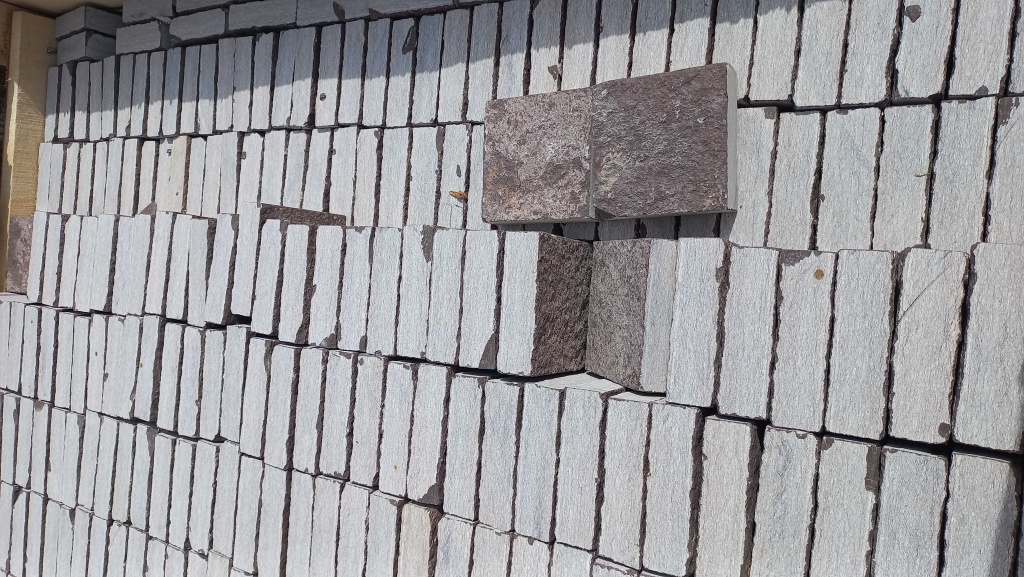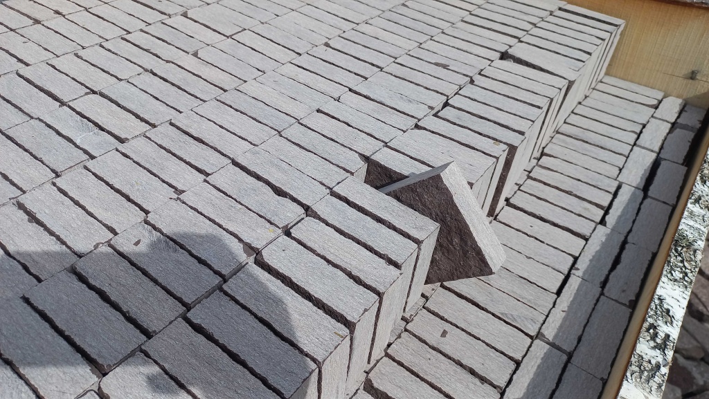 Брусчатка производится путём раскола каменных плит на камнекольном станке, имеет ровные отпиленные края, прямоугольную форму. Размер 10 см * 10 см.