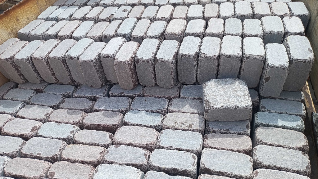 Брусчатка производится путём раскола каменных плит на камнекольном станке, имеет ровные отпиленные края, обработку галтовкой прямоугольную форму. Размер 10 см * 10 см.