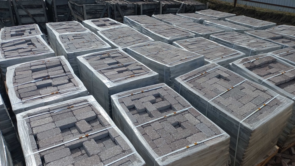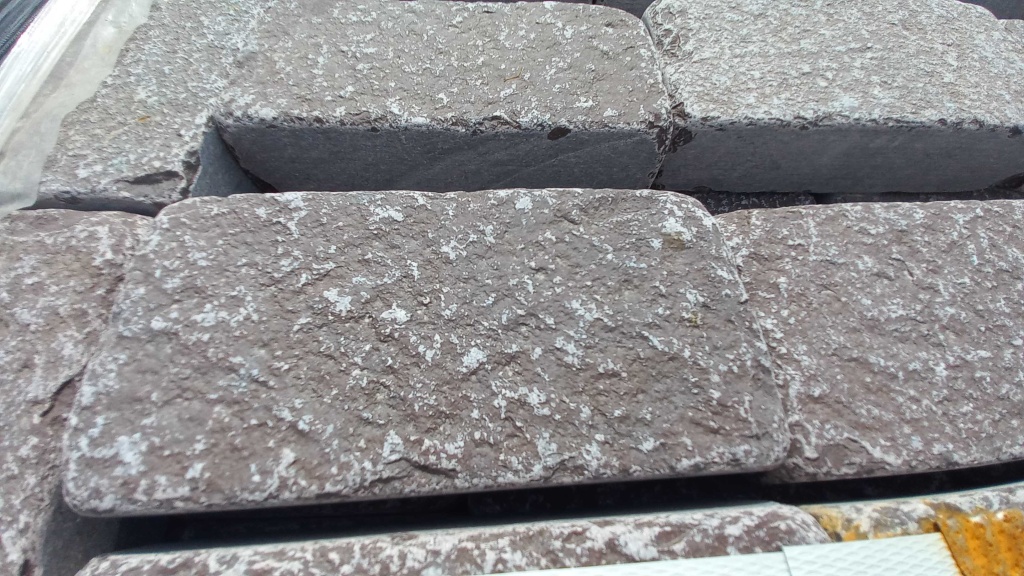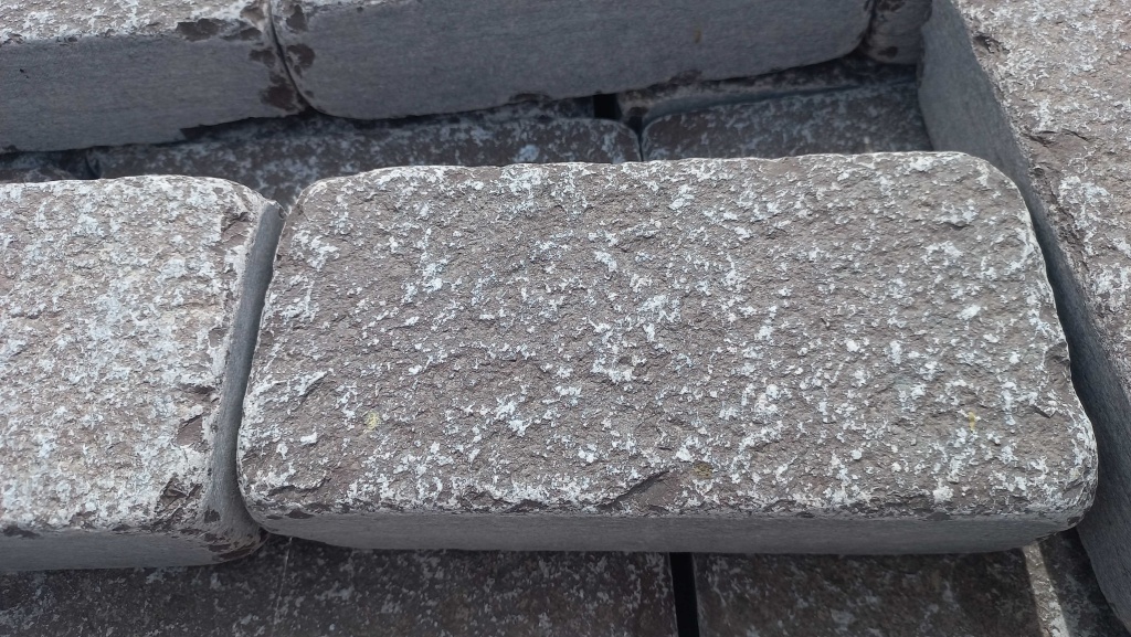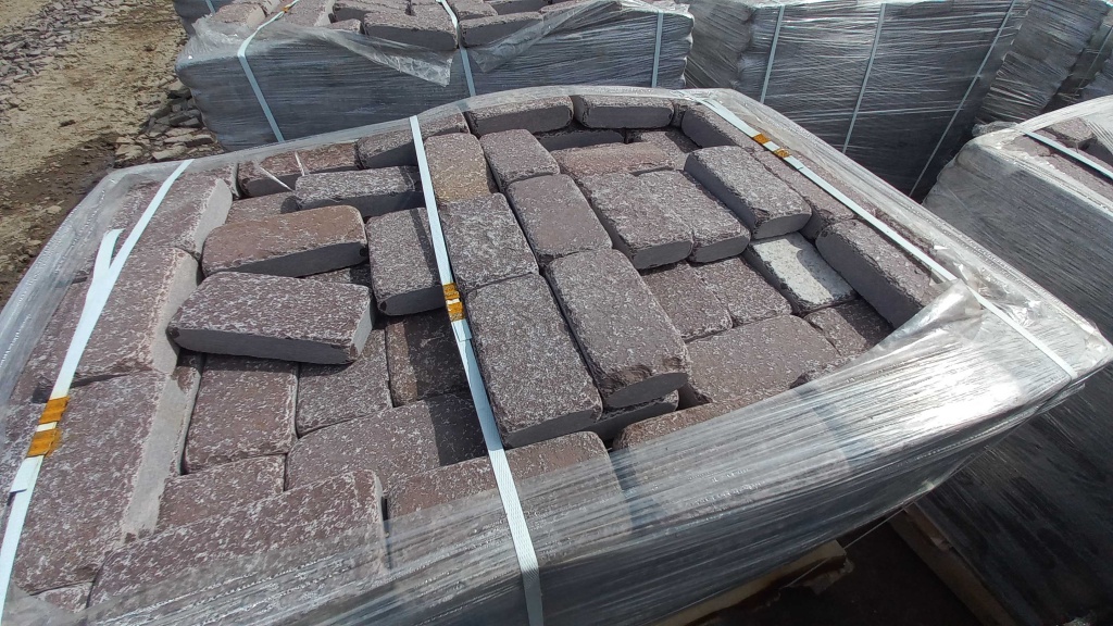 Брусчатка производится путём раскола каменных плит на камнекольном станке, имеет ровные отпиленные края, обработку галтовкой прямоугольную форму. Размер 10 см * 20 см.