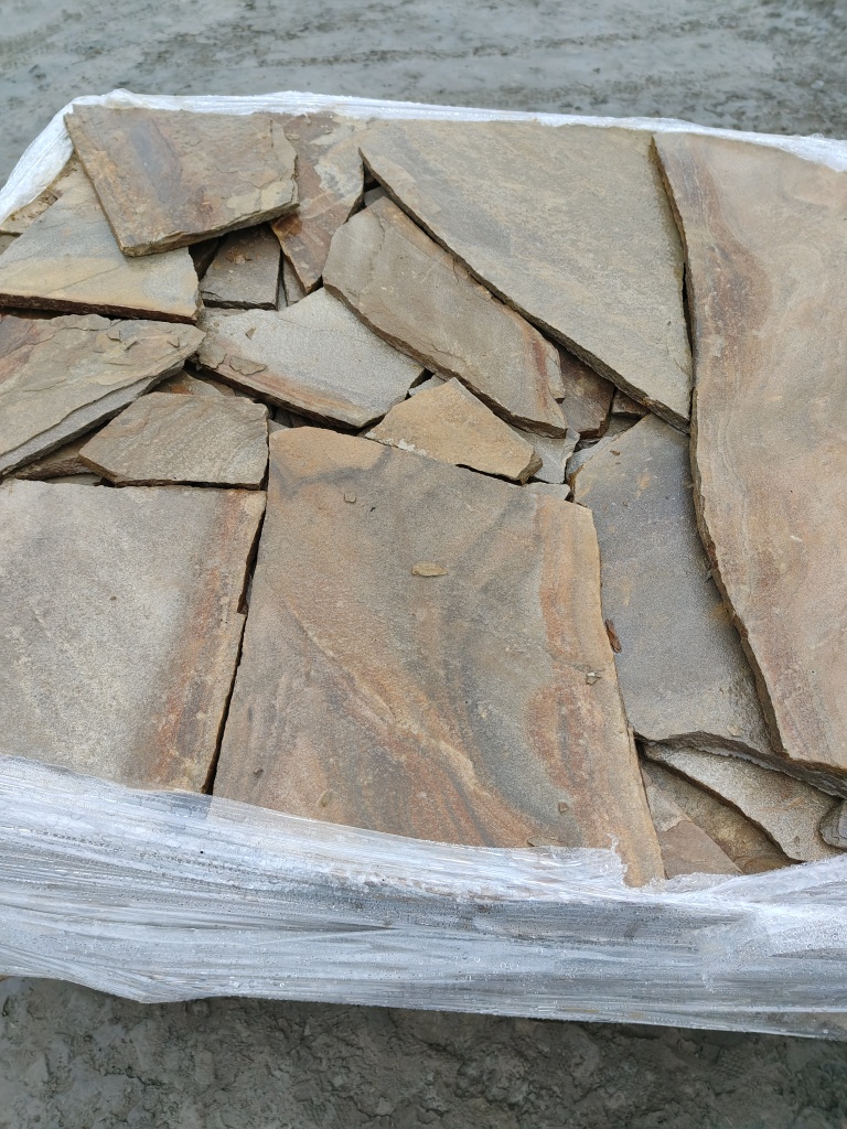 1) Облицовка или мощение природным камнем той формы, которой он уложен в поддонах -без подрезки камня. При таком виде укладки камень вообще не подгоняют по какую-то форму, его просто достают из поддона, моют, укладывают. Необходимый запас – 10%