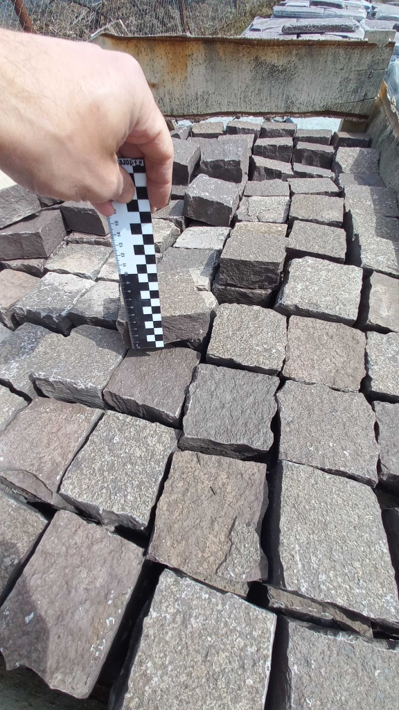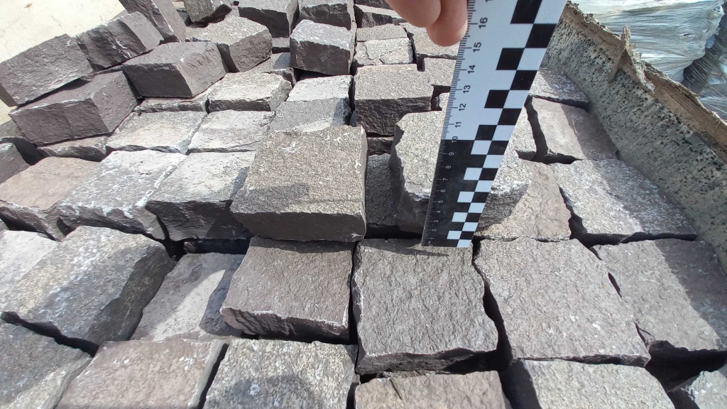 Брусчатка производится путём раскола каменных плит на камнекольном станке, имеет неровные края, прямоугольную форму. Размер 10 см * 10 см.