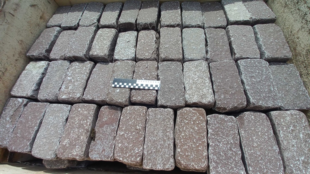 Брусчатка производится путём раскола каменных плит на камнекольном станке, с последующей галтовкой. Брусчатка имеет округлые края, прямоугольную форму. Размер 10 см * 20 см.