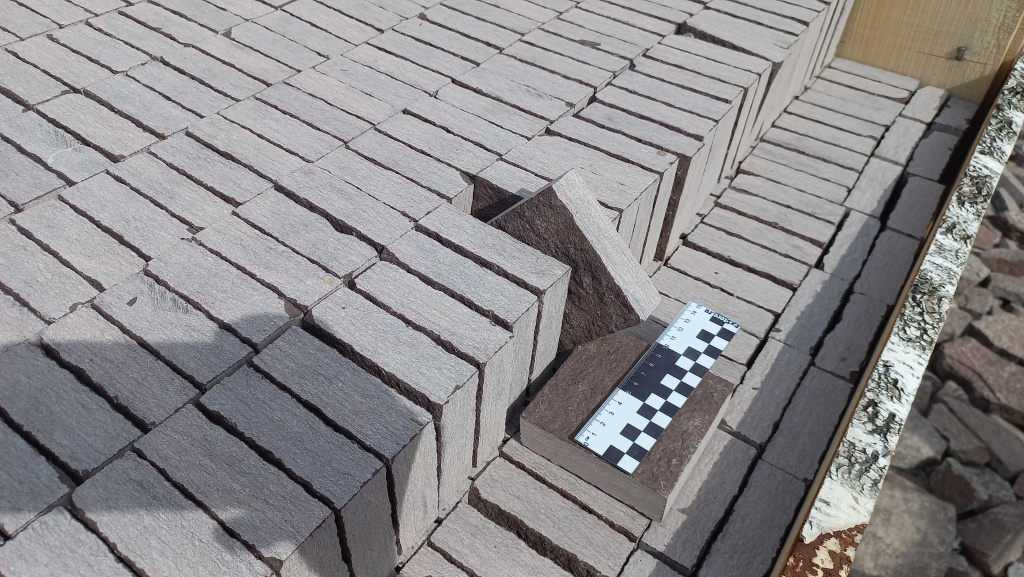 Брусчатка производится путём раскола каменных плит на камнекольном станке, имеет ровные отпиленные края, прямоугольную форму. Размер 10 см * 10 см.